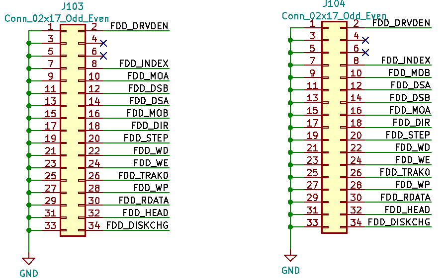 NOTE: When building this board, some floppy disk cables may have a blanking pin in the space of pin 6. It's much easier to remove this pin before soldering the connectors to the board (rather than after)!