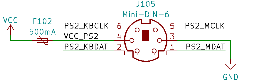 - PS/2 seems to work, but not been fully tested. Note that the connector footprint has an error - the hole for the shield on the connector was set as Non Plated Through Hole (Mechanical), so it's not possible to solder the connector to the PCB.