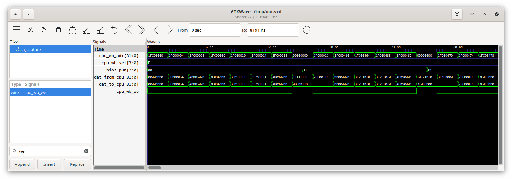 (Note - to save space in the capture buffer, I've gated off sample capturing at any point where the wishbone cycle signal is low, so these screen captures don't show the complete bus cycle).