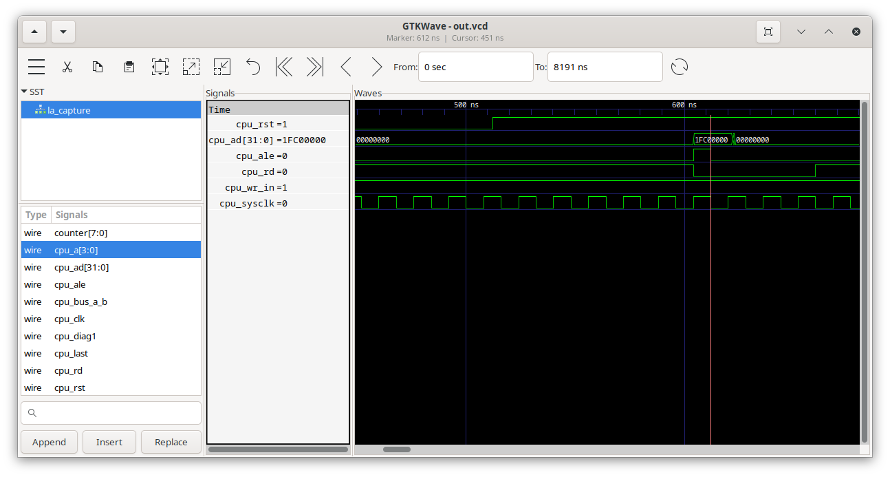 Apart from that, I've been able to run a few instructions on it, mostly just verifying that the address and data pins are connected correctly.