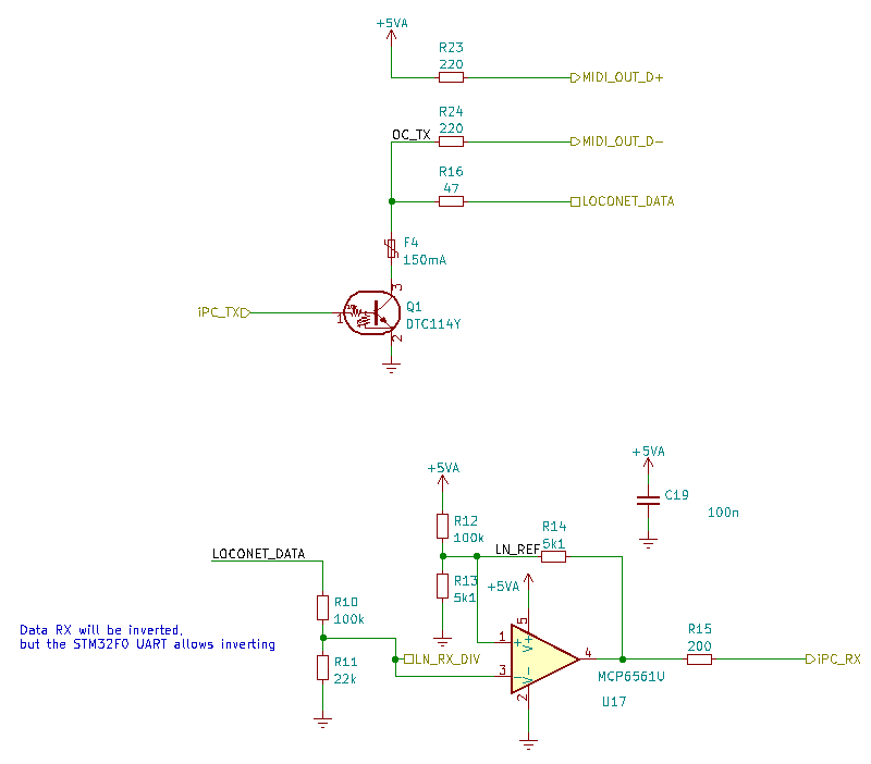 The receive side is implemented using an MCP6561 comparator (the output of this comparator is inverted compared to normal UART data as this was the easiest way to select the hysteresis required by LocoNet, but this can be corrected in the STM32F0's UART).
