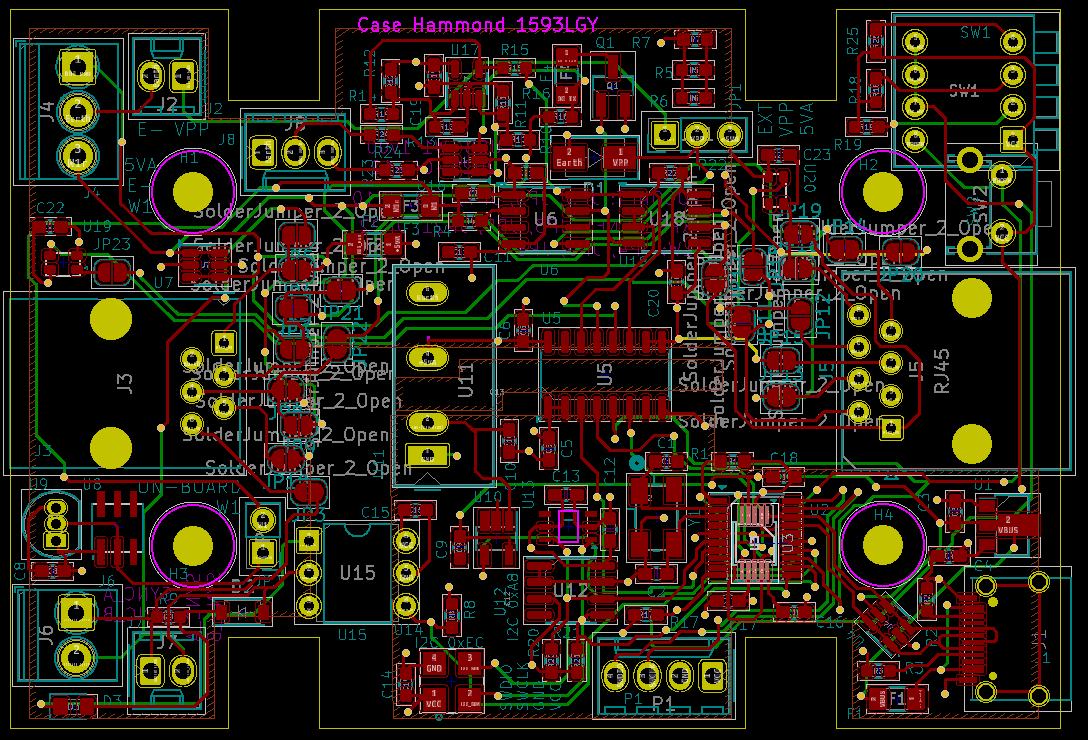 The PCB is designed to fit into a Hammond 1593L case, with 3D printed end plates.