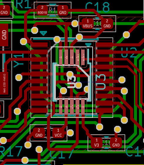 To keep the board size down, the footprint for the CH343 is placed within the footprint of the STM32F042, which works well (as only one of those two parts could ever be fitted on a board at a time):